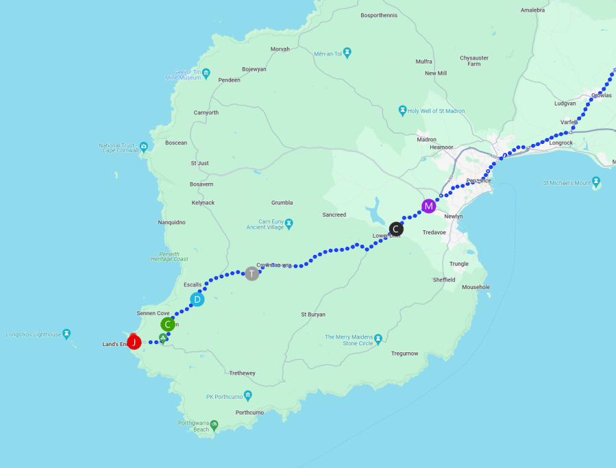 Day 1 of the Virtual Challenge. Five of the six participants have left Land’s End car park and famous signpost behind, beginning the 861 mile journey to the tip of Great Britain. Matt and Chris have nearly reached the first major town on route (Penzance), with seven and six miles covered respectively.