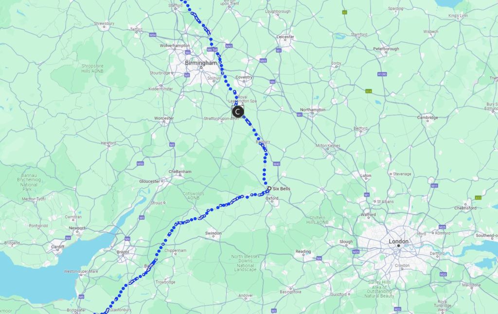 You will notice that Chris isn’t on that map. He now gets his own, having passed his home in Witney, the Six Bells in Kidlington, and is now headed to the midlands, currently nearing Royal Leamington Spa.