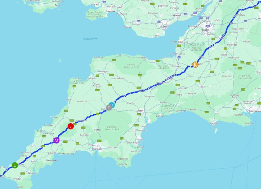 You will notice that Chris isn’t on that map. He now gets his own, having passed his home in Witney, the Six Bells in Kidlington, and is now headed to the midlands, currently nearing Royal Leamington Spa.