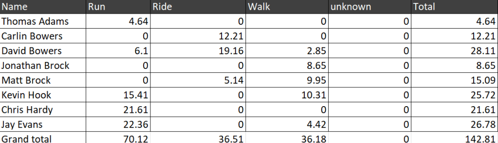 On to individual goals. Based on your 2024 milage (in Strava) across all activity types, plus a healthy 10% increase, these are you goals for the year. I will provide sporadic updates on your progress each month.