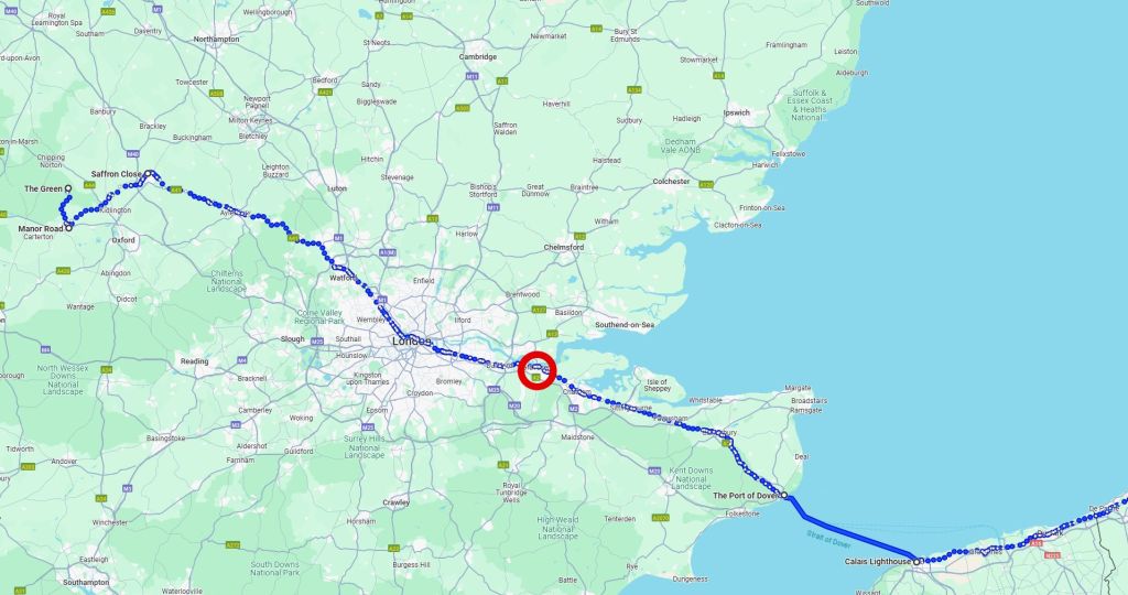 And we’re off, again. Bursting out of the gates, past Matt, Tom, Chris, and Kev’s abodes and steaming across London. We are now in Gravesend, heading for the Port of Dover. After five days we are slightly ahead of target. Good job.