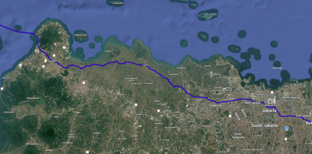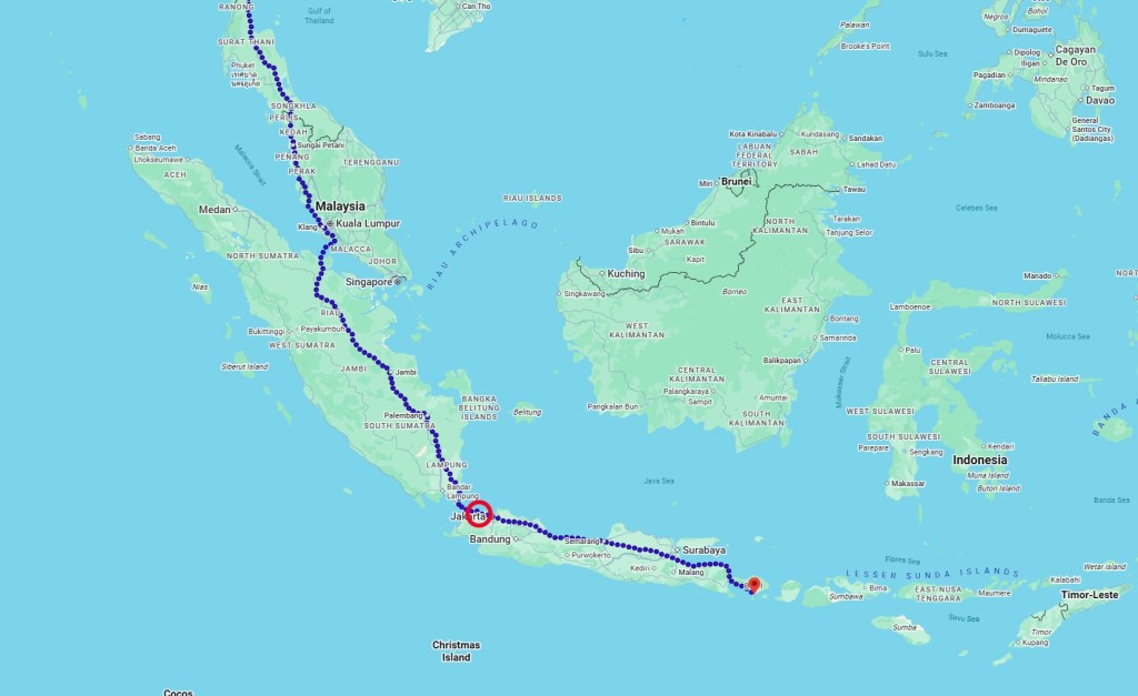 We’re east of Cilegon, Indonesia. Seems nice. We’re also 17 miles ahead of target. Bravo!