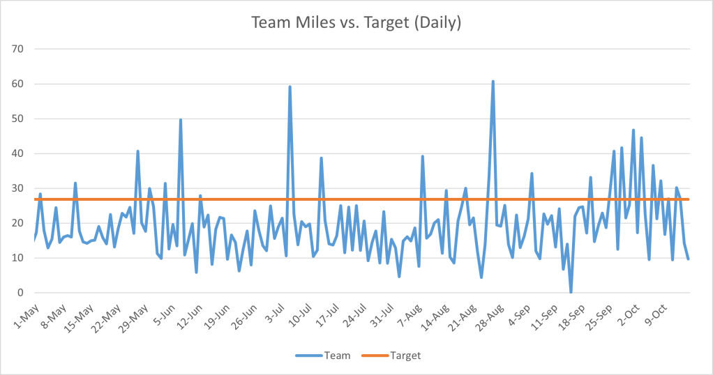 A new week, a new country. We’re in the poor man’s Temu – Tamu in Myanmar, nearly 7,000 miles away from our starting point in the Cotswolds. Sure, our target may now be on another landmass, but we’re crushing it. I’d particularly like to highlight Matt and Chris, who have definitely upped their running game in recent weeks. Solid work. Not forgetting Johnny who has smashed through his target, or Kev who is cutting it remarkably close.