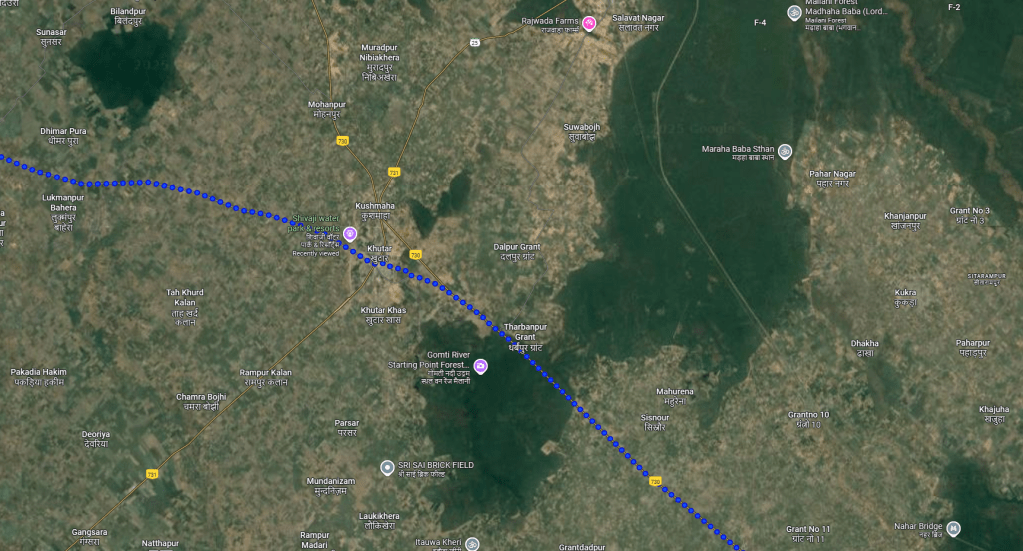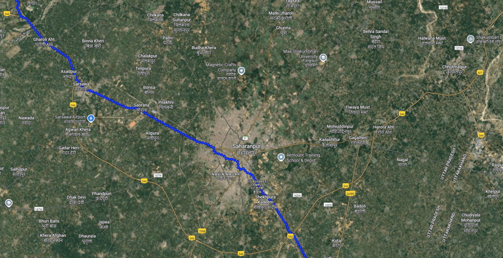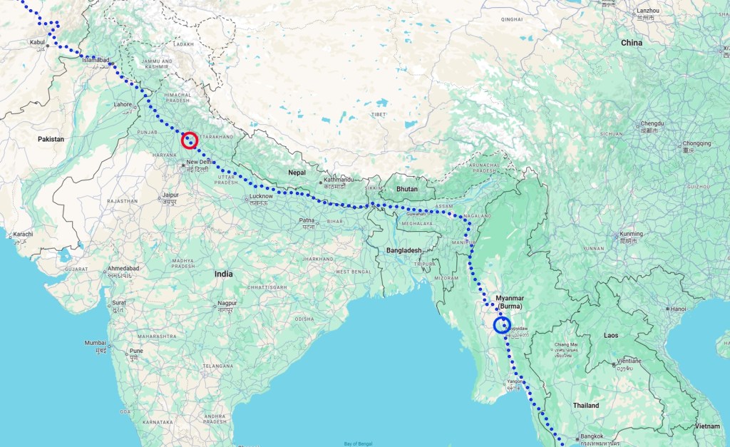 Where are we now? Saharanpur, India. For the next few weeks we’ll be following the line of the Himalayan mountains off to our left. Shout if you spot Everest.