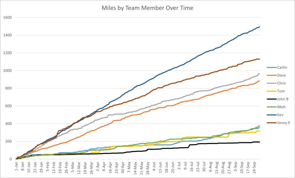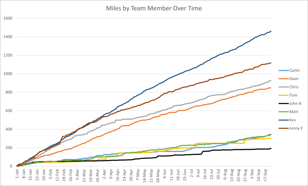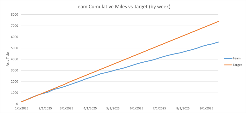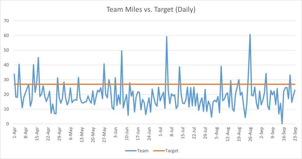 With Carlin having surpassed her initial goal of 261 miles and seemingly making us all look bad, I made the mistake of suggesting “upping the goal”. Her new target would be 500 miles (or approximately a 100% increase).